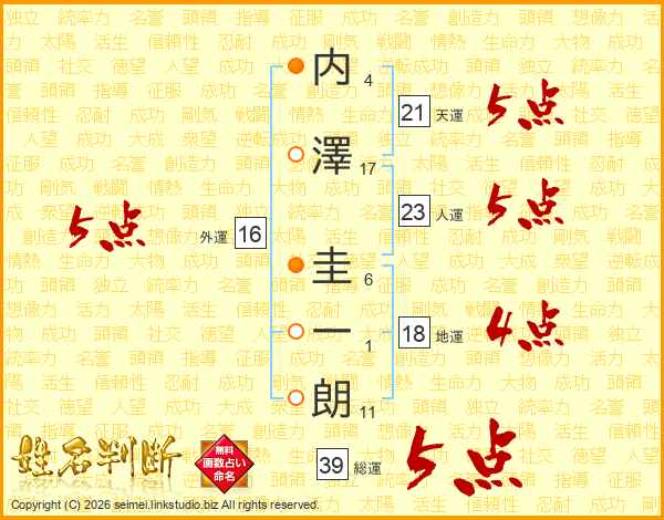 内(4画)澤(17画) 圭(6画)一(1画)朗(11画)