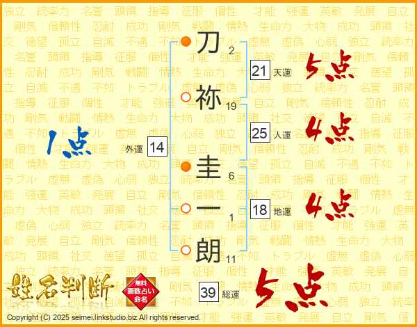 刀(2画)祢(19画) 圭(6画)一(1画)朗(11画)