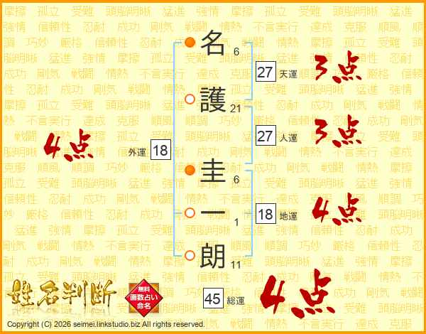 名(6画)護(21画) 圭(6画)一(1画)朗(11画)