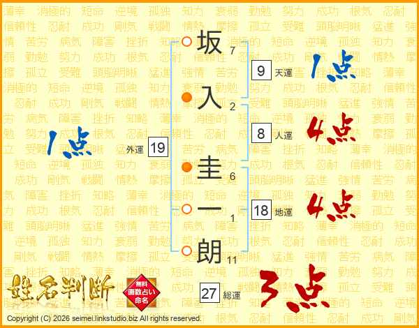 坂(7画)入(2画) 圭(6画)一(1画)朗(11画)