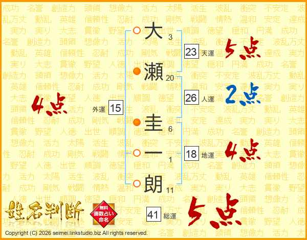 大瀬圭一朗さんの総運は41画の5点!