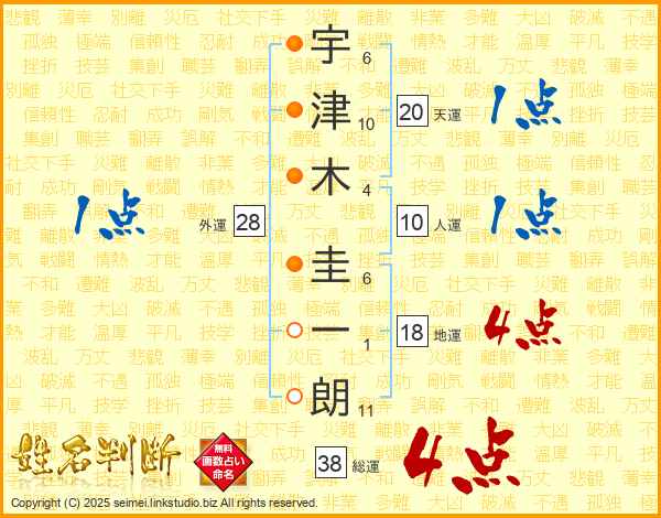 宇(6画)津(10画)木(4画) 圭(6画)一(1画)朗(11画)