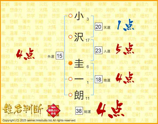 小(3画)沢(17画) 圭(6画)一(1画)朗(11画)