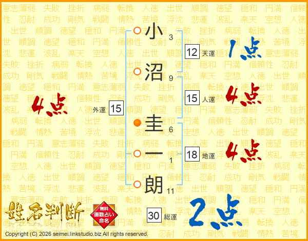 小(3画)沼(9画) 圭(6画)一(1画)朗(11画)