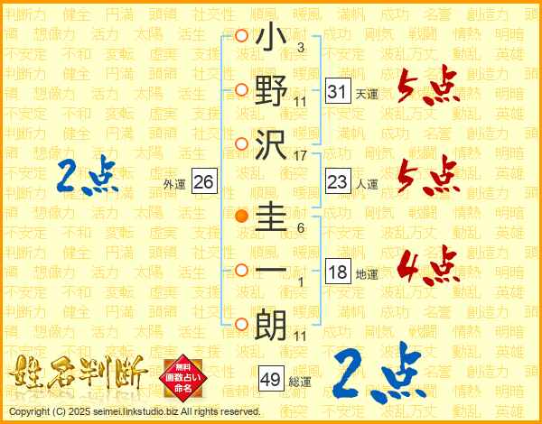 小(3画)野(11画)沢(17画) 圭(6画)一(1画)朗(11画)