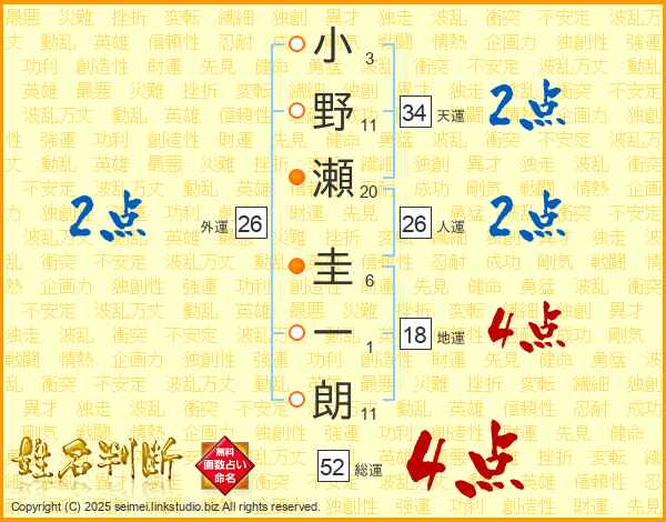 小(3画)野(11画)瀬(20画) 圭(6画)一(1画)朗(11画)