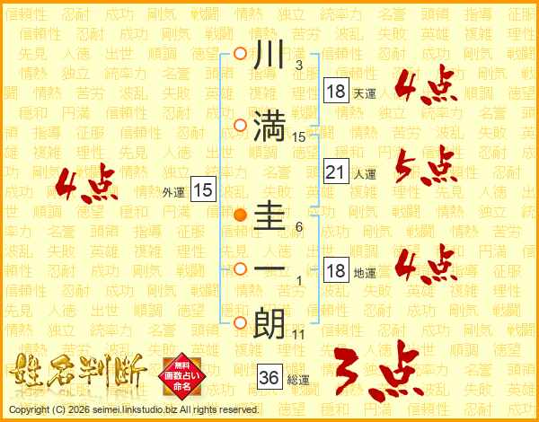 川(3画)満(15画) 圭(6画)一(1画)朗(11画)