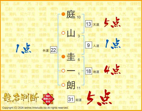 庭山圭一朗さんの総運は31画の5点!