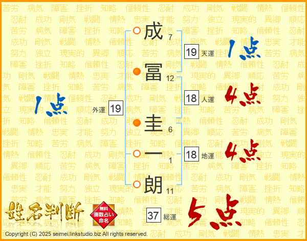 成(7画)冨(12画) 圭(6画)一(1画)朗(11画)