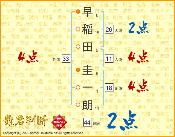 早稲田圭一朗さんの総運は44画の2点!