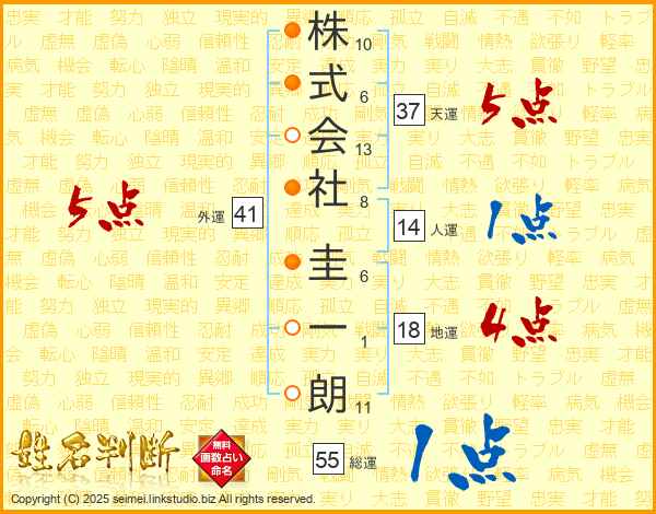株(10画)式(6画)会(13画)社(8画) 圭(6画)一(1画)朗(11画)