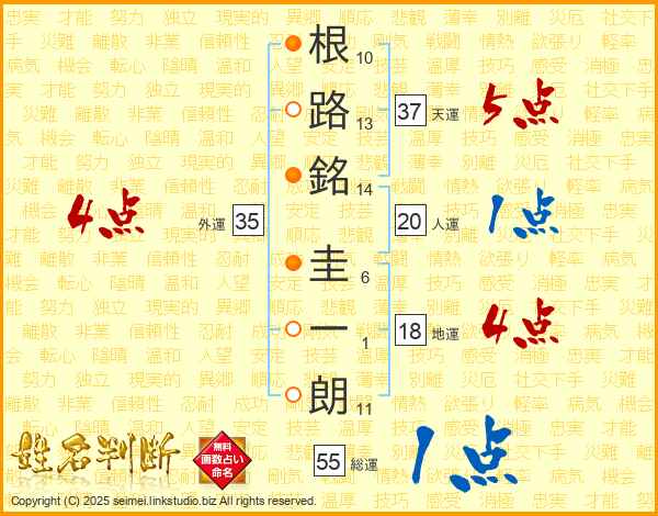 根(10画)路(13画)銘(14画) 圭(6画)一(1画)朗(11画)