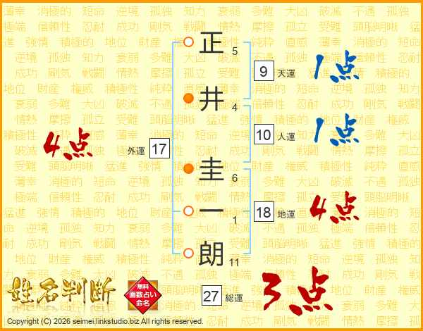 正(5画)井(4画) 圭(6画)一(1画)朗(11画)