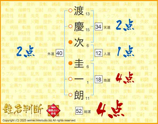 渡(13画)慶(15画)次(6画) 圭(6画)一(1画)朗(11画)