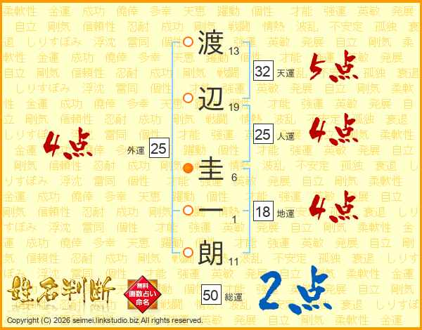 渡(13画)辺(19画) 圭(6画)一(1画)朗(11画)