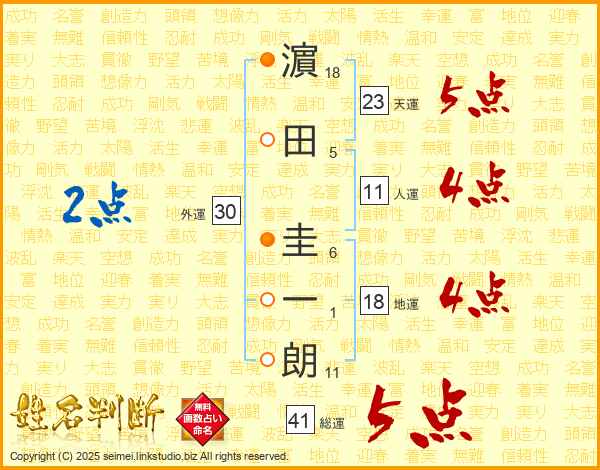 濵(18画)田(5画) 圭(6画)一(1画)朗(11画)