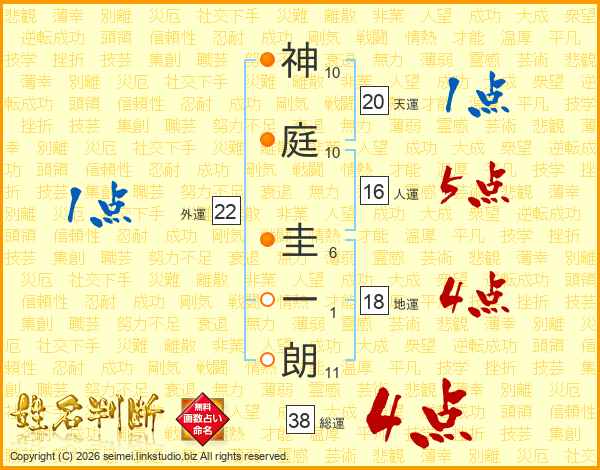 神(10画)庭(10画) 圭(6画)一(1画)朗(11画)