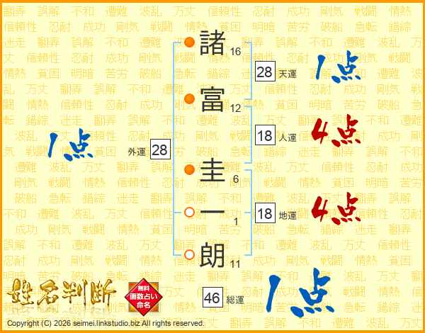 諸(16画)富(12画) 圭(6画)一(1画)朗(11画)