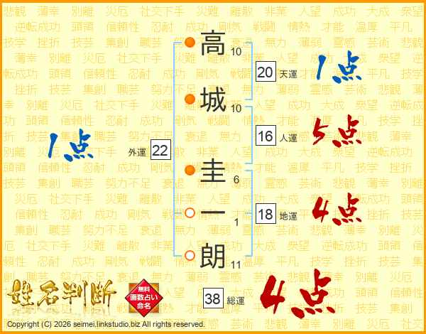 高(10画)城(10画) 圭(6画)一(1画)朗(11画)