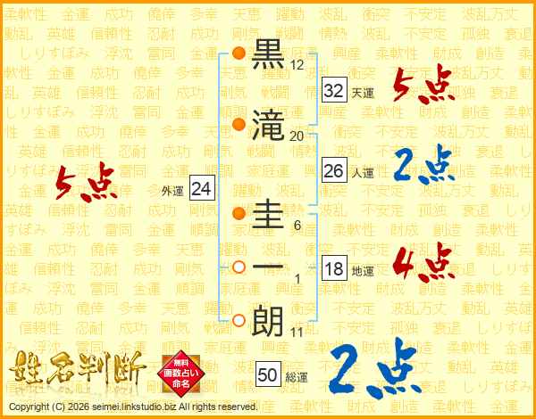 黒(12画)滝(20画) 圭(6画)一(1画)朗(11画)