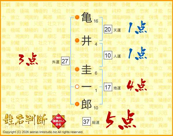 亀井圭一郎さんの総運は37画の5点!