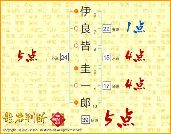 伊(6画)良(7画)皆(9画) 圭(6画)一(1画)郎(10画)