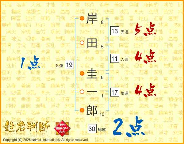 岸(8画)田(5画) 圭(6画)一(1画)郎(10画)