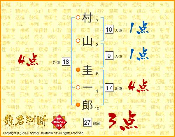 村(7画)山(3画) 圭(6画)一(1画)郎(10画)