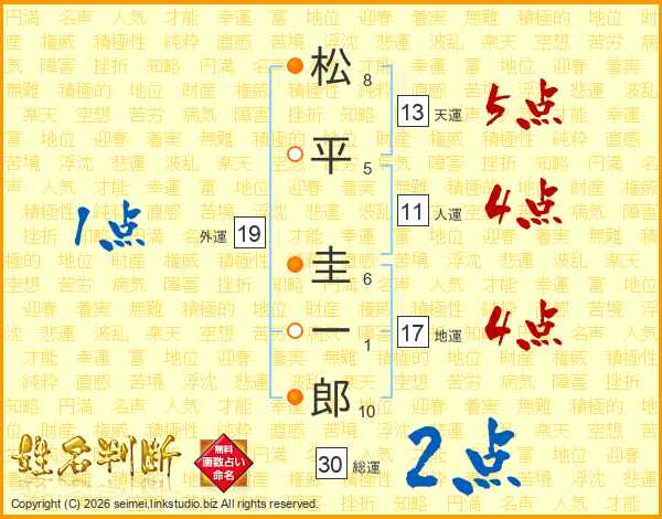 松(8画)平(5画) 圭(6画)一(1画)郎(10画)