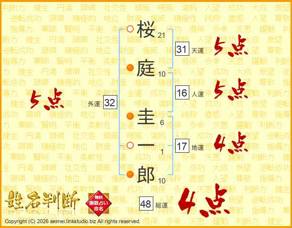 桜(21画)庭(10画) 圭(6画)一(1画)郎(10画)