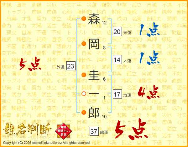 森(12画)岡(8画) 圭(6画)一(1画)郎(10画)