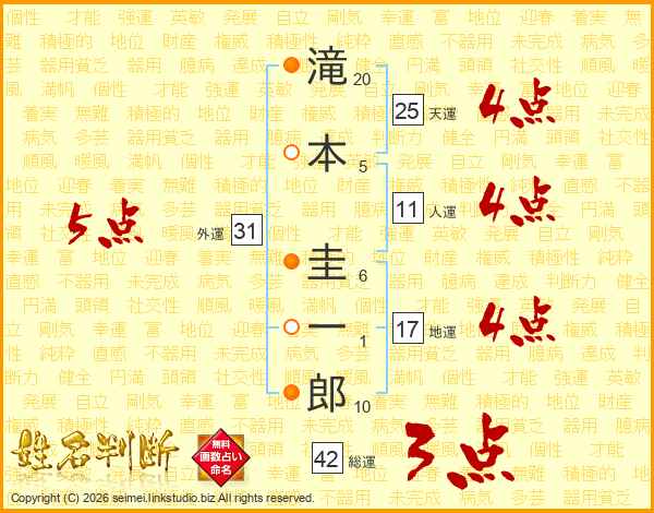 滝(20画)本(5画) 圭(6画)一(1画)郎(10画)