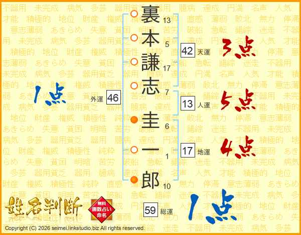 裏本謙志圭一郎さんの人運は13画の5点!