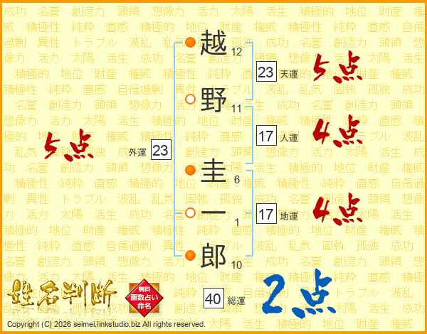 越(12画)野(11画) 圭(6画)一(1画)郎(10画)
