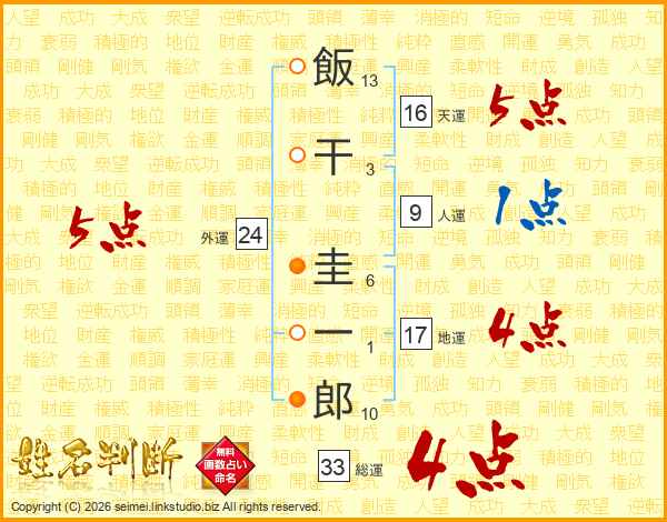 飯(13画)干(3画) 圭(6画)一(1画)郎(10画)