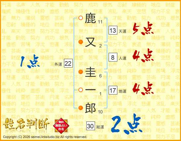 鹿又圭一郎さんの総運は30画の2点!