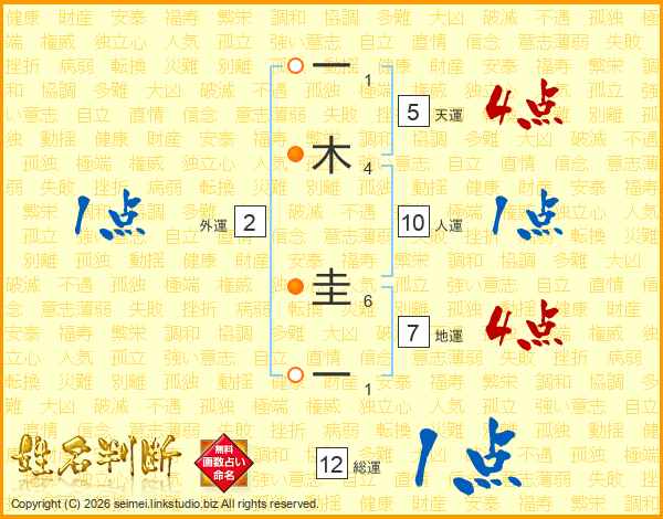 画数の奇数(○陽)と偶数(●陰)の配列で吉凶を占います。どちらかにかたよる名前は大凶名で避ける必要があります。画数の奇数偶数。