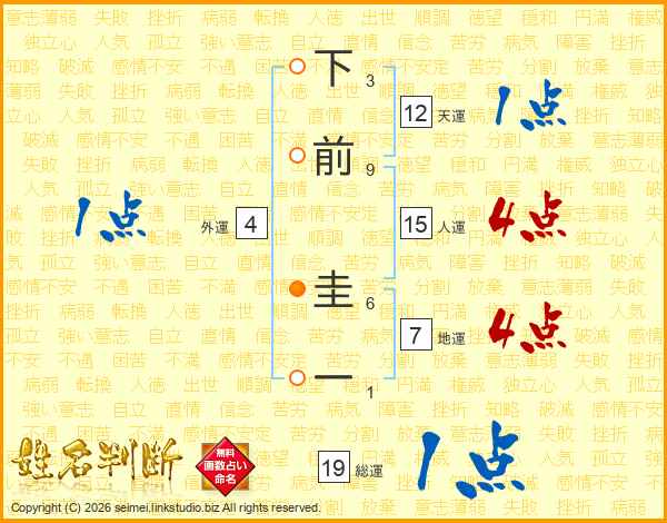 生活面を象徴する運勢です。外部から受ける影響力を表し、結婚運、家庭運や職場、環境への順応性を表します。総運から人運を引いた画数。姓や名が1文字の場合を除く。