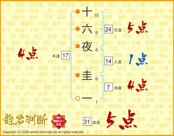 生活面を象徴する運勢です。外部から受ける影響力を表し、結婚運、家庭運や職場、環境への順応性を表します。総運から人運を引いた画数。姓や名が1文字の場合を除く。