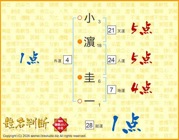 生活面を象徴する運勢です。外部から受ける影響力を表し、結婚運、家庭運や職場、環境への順応性を表します。総運から人運を引いた画数。姓や名が1文字の場合を除く。