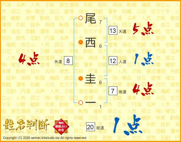 生活面を象徴する運勢です。外部から受ける影響力を表し、結婚運、家庭運や職場、環境への順応性を表します。総運から人運を引いた画数。姓や名が1文字の場合を除く。
