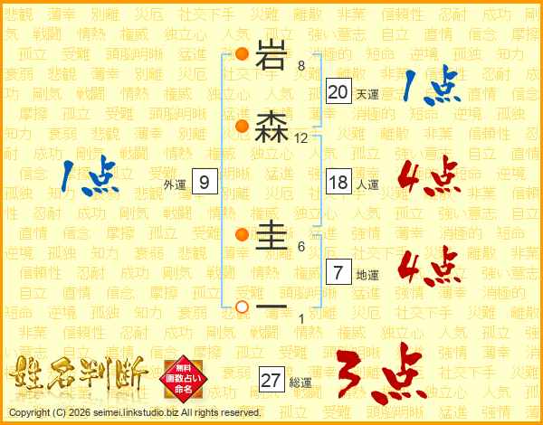 生活面を象徴する運勢です。外部から受ける影響力を表し、結婚運、家庭運や職場、環境への順応性を表します。総運から人運を引いた画数。姓や名が1文字の場合を除く。