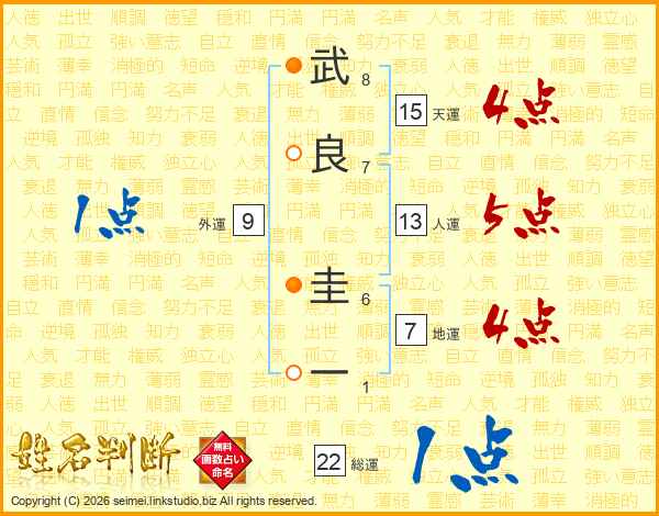 生活面を象徴する運勢です。外部から受ける影響力を表し、結婚運、家庭運や職場、環境への順応性を表します。総運から人運を引いた画数。姓や名が1文字の場合を除く。