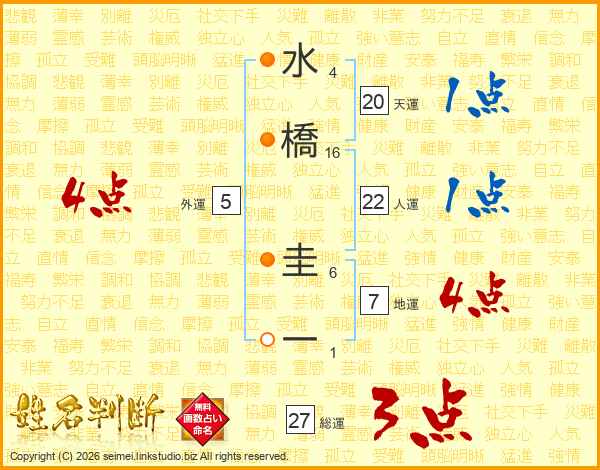 画数の奇数(○陽)と偶数(●陰)の配列で吉凶を占います。どちらかにかたよる名前は大凶名で避ける必要があります。画数の奇数偶数。