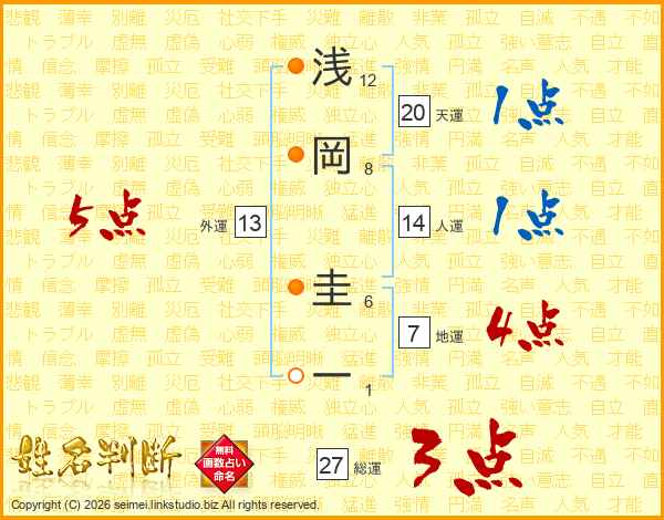 浅(12画)岡(8画) 圭(6画)一(1画)