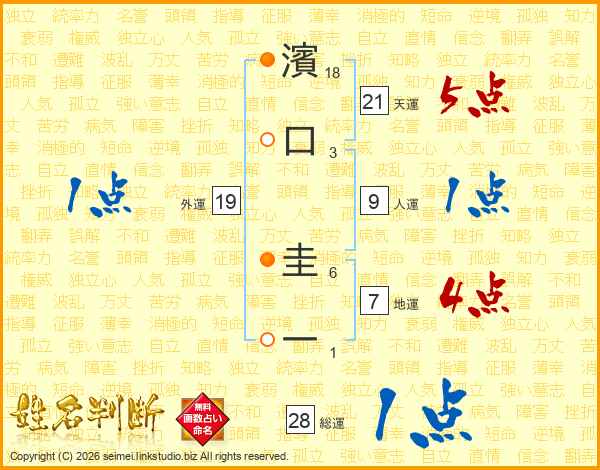 生活面を象徴する運勢です。外部から受ける影響力を表し、結婚運、家庭運や職場、環境への順応性を表します。総運から人運を引いた画数。姓や名が1文字の場合を除く。