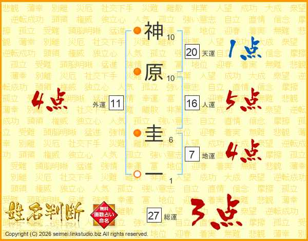 生活面を象徴する運勢です。外部から受ける影響力を表し、結婚運、家庭運や職場、環境への順応性を表します。総運から人運を引いた画数。姓や名が1文字の場合を除く。