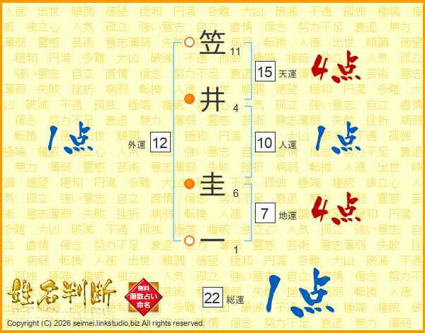 画数の奇数(○陽)と偶数(●陰)の配列で吉凶を占います。どちらかにかたよる名前は大凶名で避ける必要があります。画数の奇数偶数。