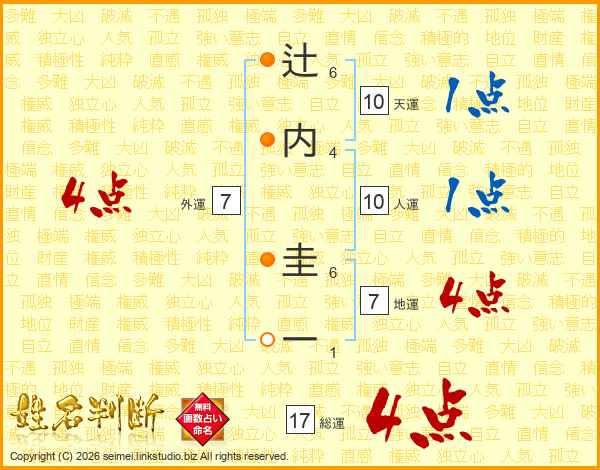 生活面を象徴する運勢です。外部から受ける影響力を表し、結婚運、家庭運や職場、環境への順応性を表します。総運から人運を引いた画数。姓や名が1文字の場合を除く。