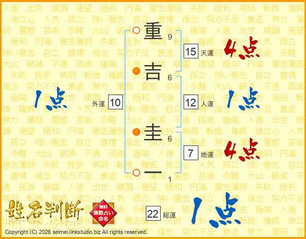 生活面を象徴する運勢です。外部から受ける影響力を表し、結婚運、家庭運や職場、環境への順応性を表します。総運から人運を引いた画数。姓や名が1文字の場合を除く。